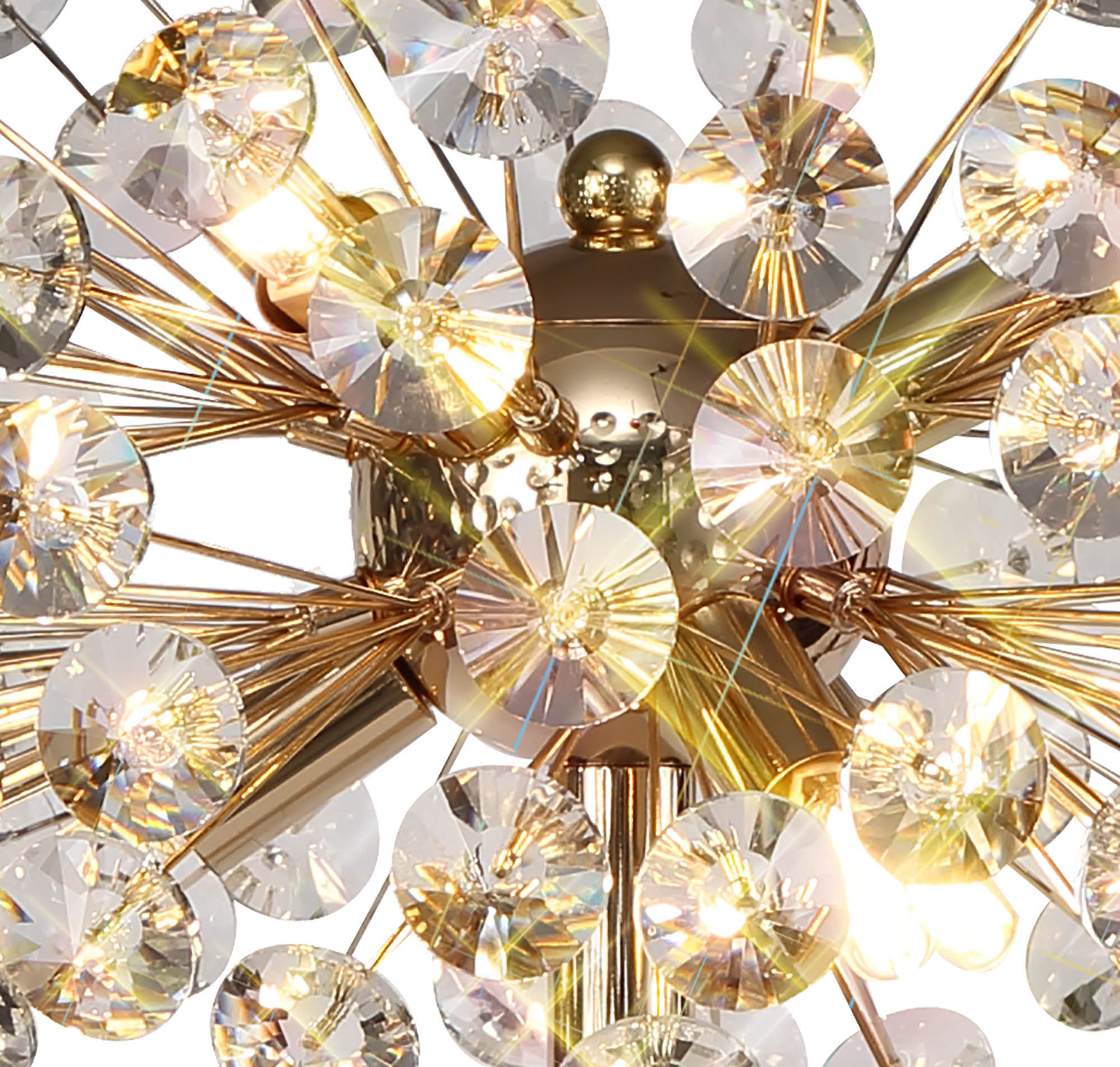 This beautiful comprehensive collection available in either a polished chrome or french gold colour finish, uses slim stems angled erratically to form an enchanting cluster of clear crystal disks. The lines of the central framework of round, tiered and oblong pendants, act as a base from which the crystals can sit around the G9 lampholders ensuring the light emitted from the chosen lamp refracts through each facette throwing sublime spectrums.