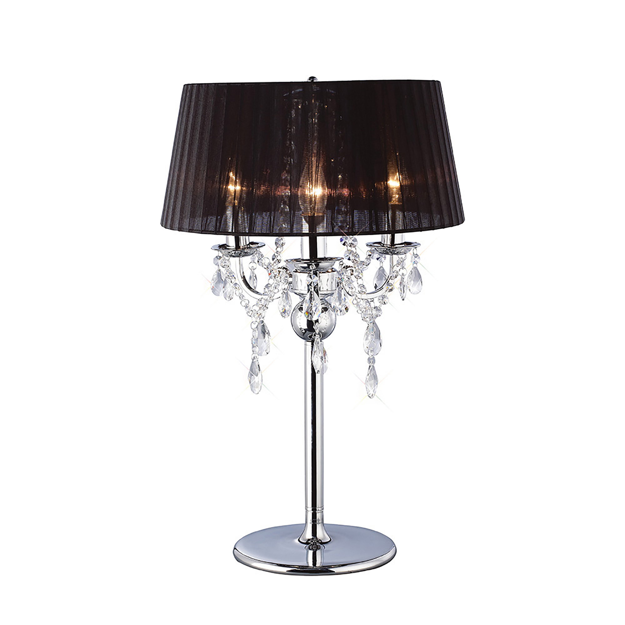 3 Light Chrome Table Lamp With Stunning Asfour Crystal Detail & Black Shade, A stylish fitting that would be a classy touch to any suitable room. A ceiling pendant, wall fitting and floor lamp are also available from this stunning range. This truly exquisite fitting is also available in polished chrome with a white shade and an antique brass base with a choice of ivory cream or amber cream shades.