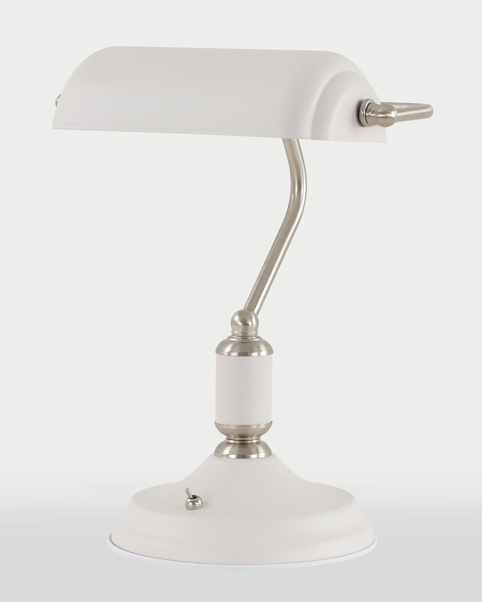 A modern style bankers lamp, finished in sand white & satin nickel detail