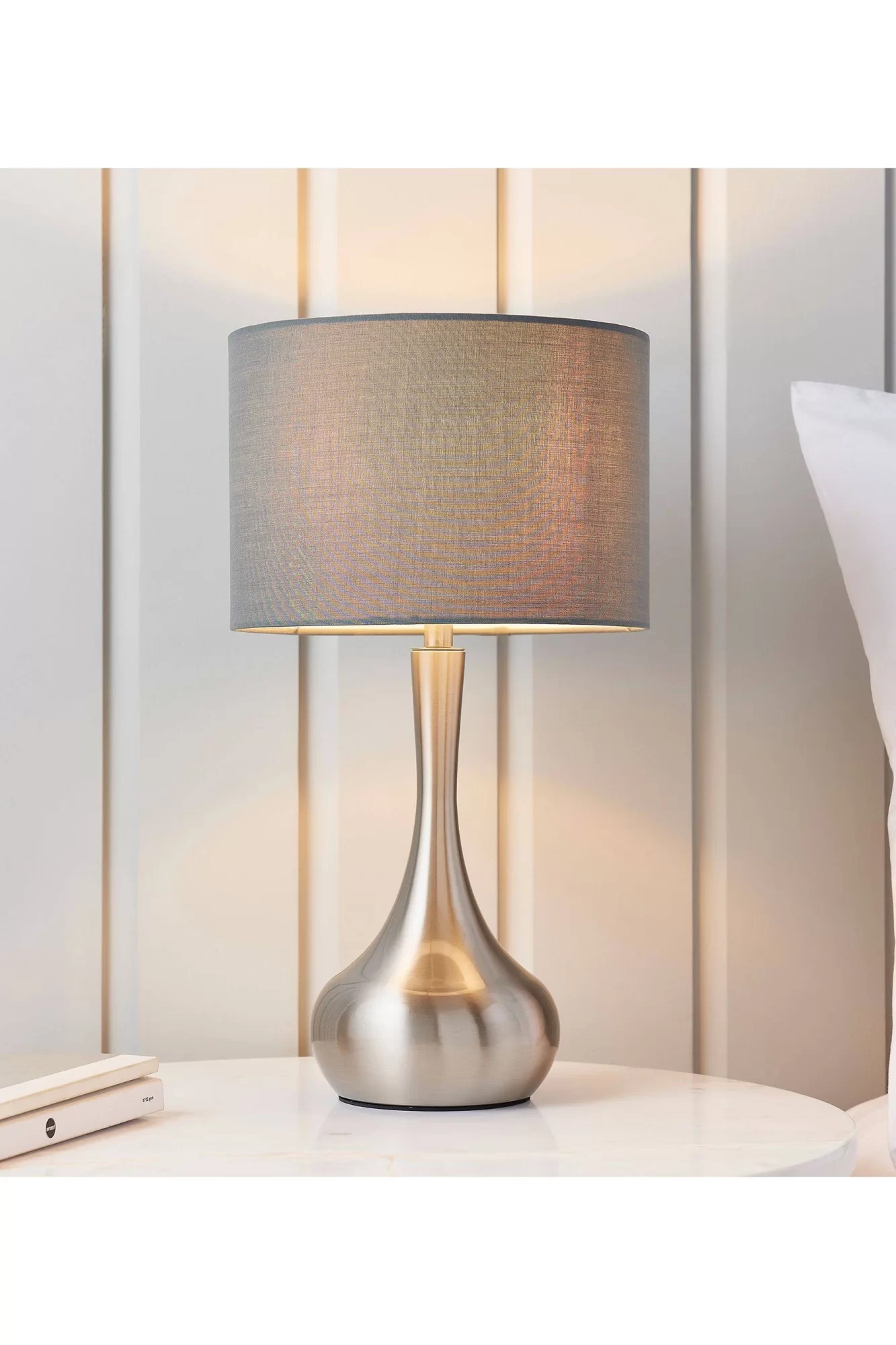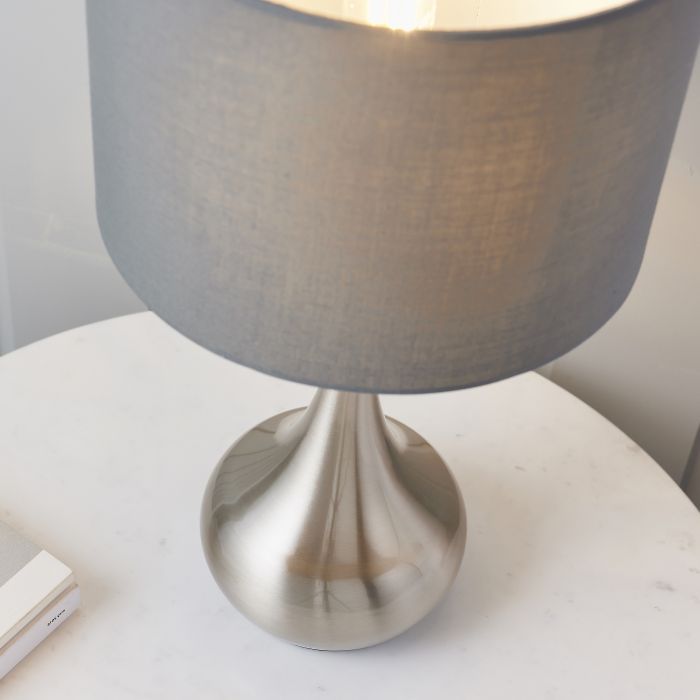 A stylish table light with a satin nickel plate and a dark grey fabric shade. Clever touch technology for operating and dimming.