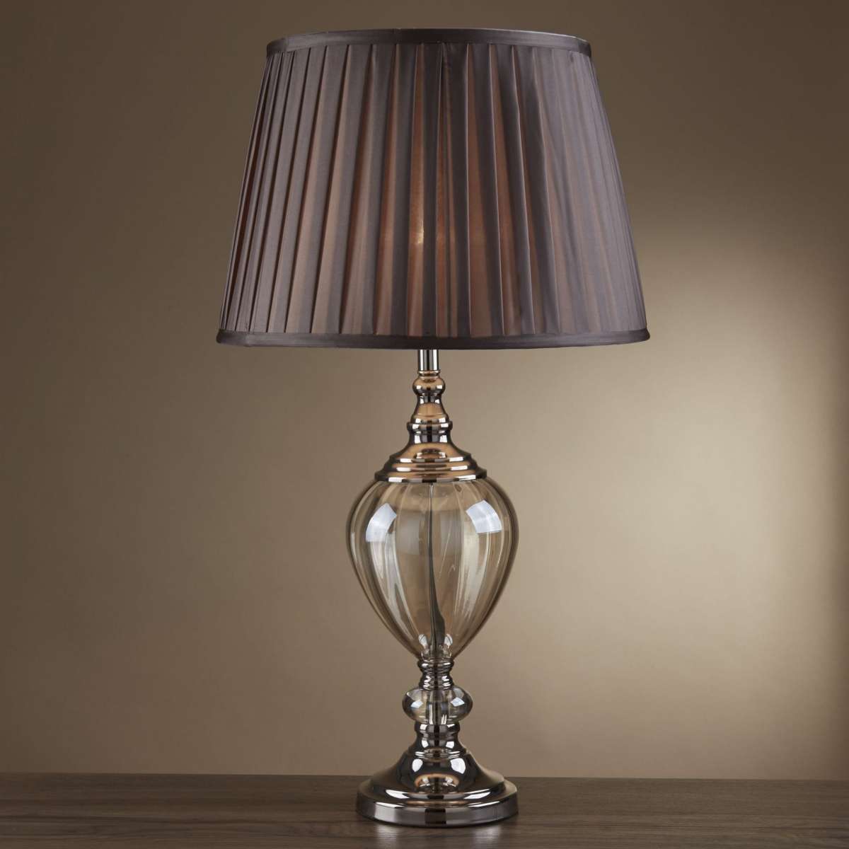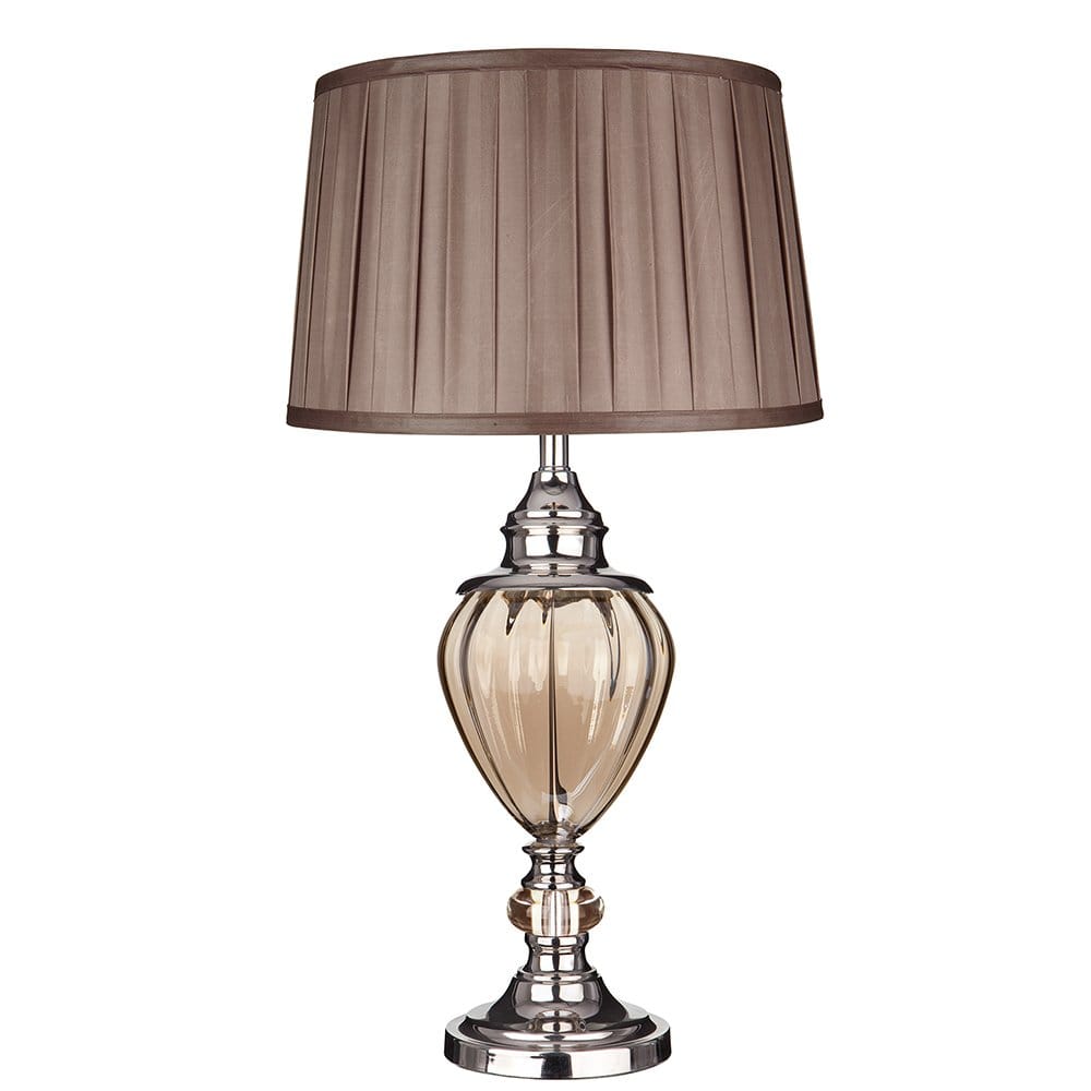 This is traditional lamp with a contemporary finish. The base features a large amber glass urn with a chrome finish, with a tapered brown pleated shade above to complete the look. It is intricate and ornate from top to bottom.