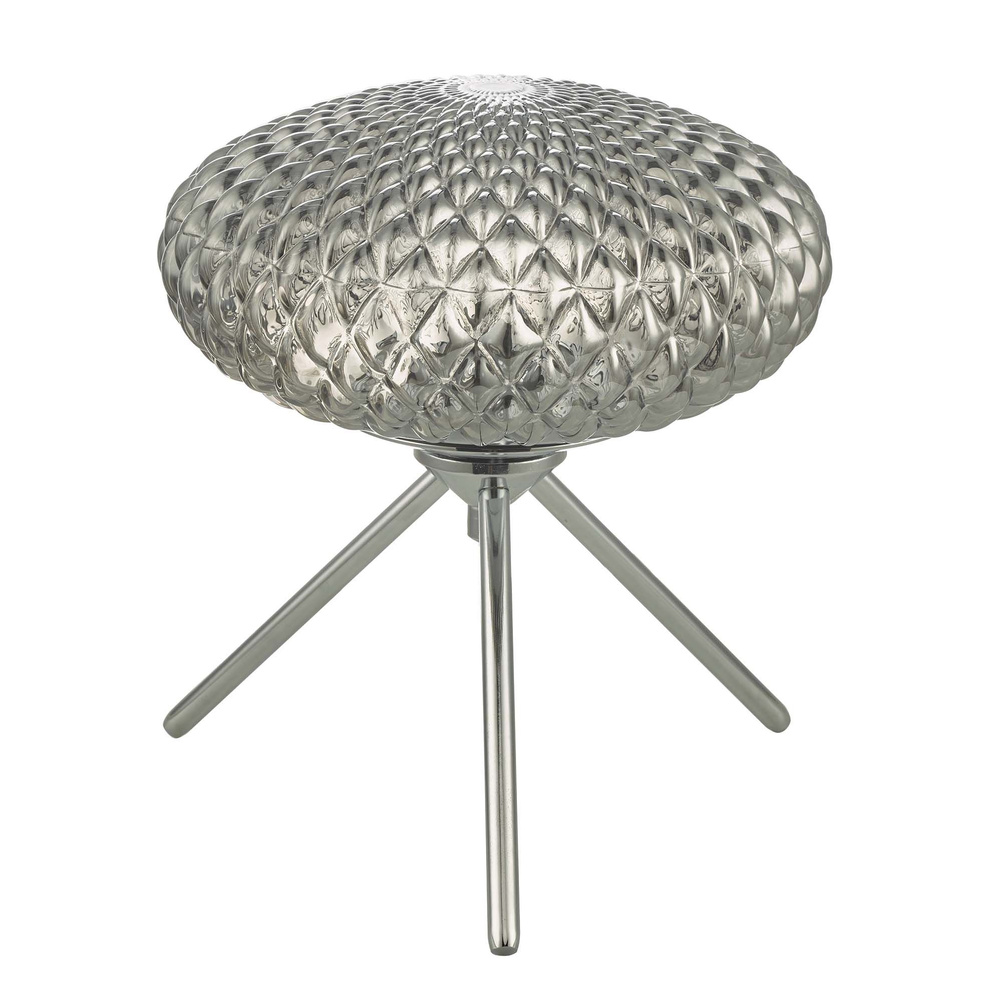The Bibiana Table Lamp Polished Chrome with Smoked Glass Small, is a small pressed patterned glass table lamp complete with clear glass with a smooth polished chrome tripod style base. Available in two sizes with matching pendant and wall lights.