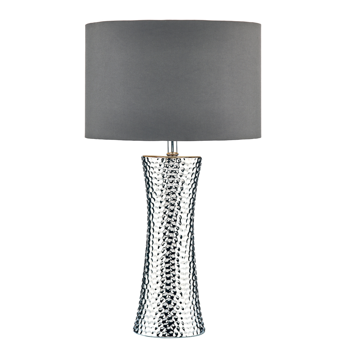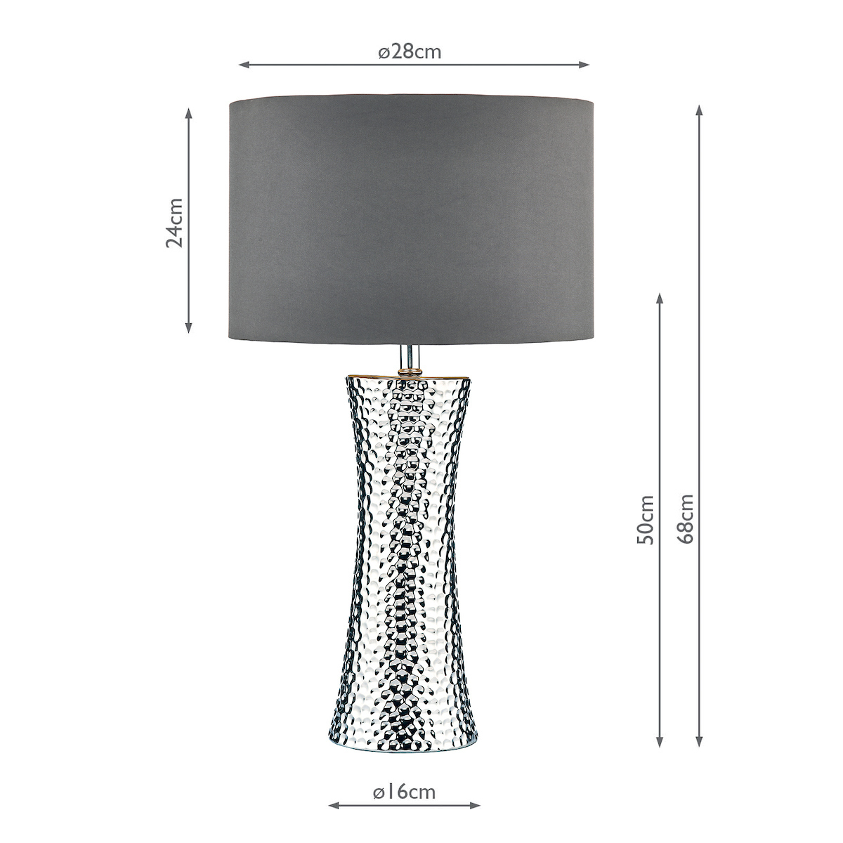 The KOBRA is a ceramic table lamp with a hammered style base in a silver finish and comes complete with a grey satin drum shade with grey lining.