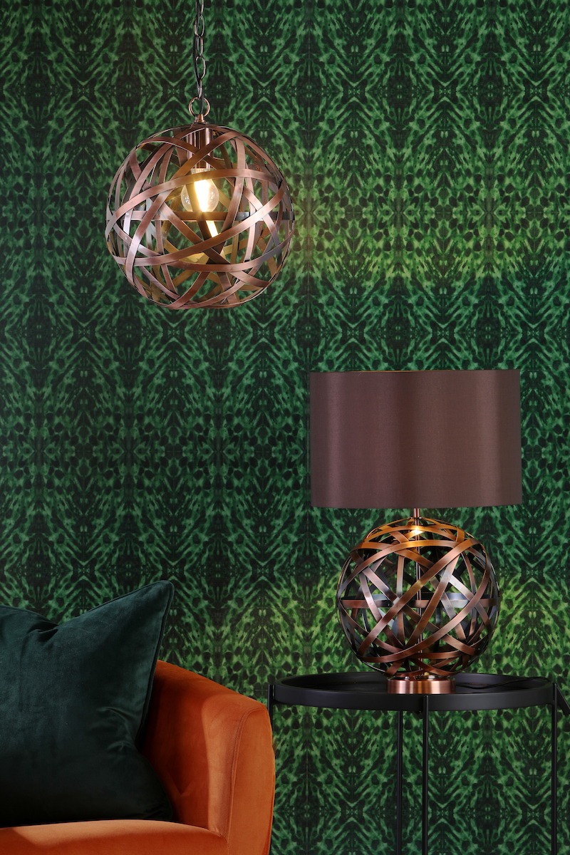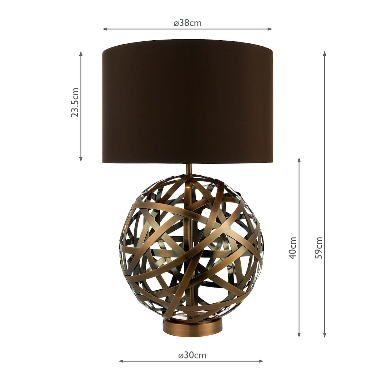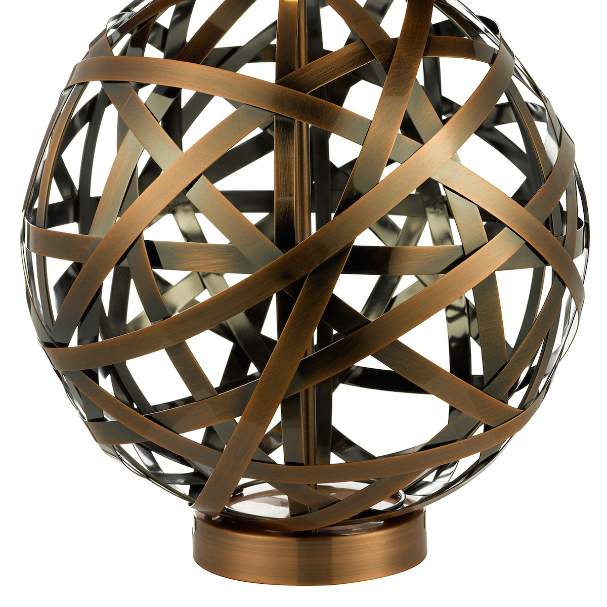 Table lamp features a large “Atlas” style ball formed from artfully woven antique copper bands, complete with a rich faux silk brown shade lined in brown to give a beautiful light spill.