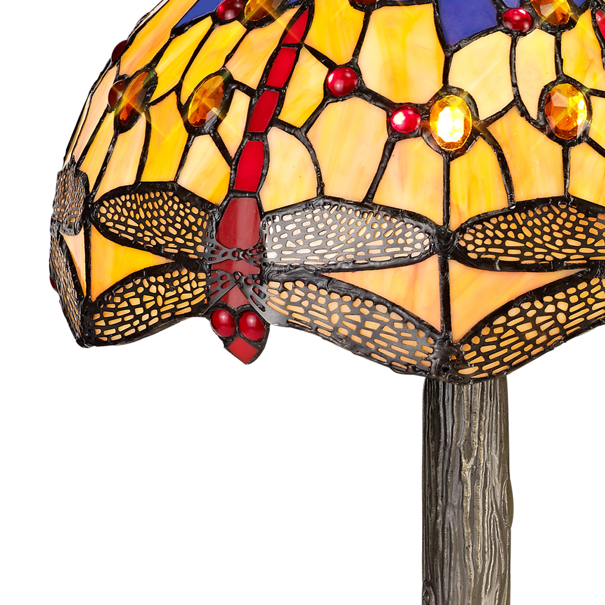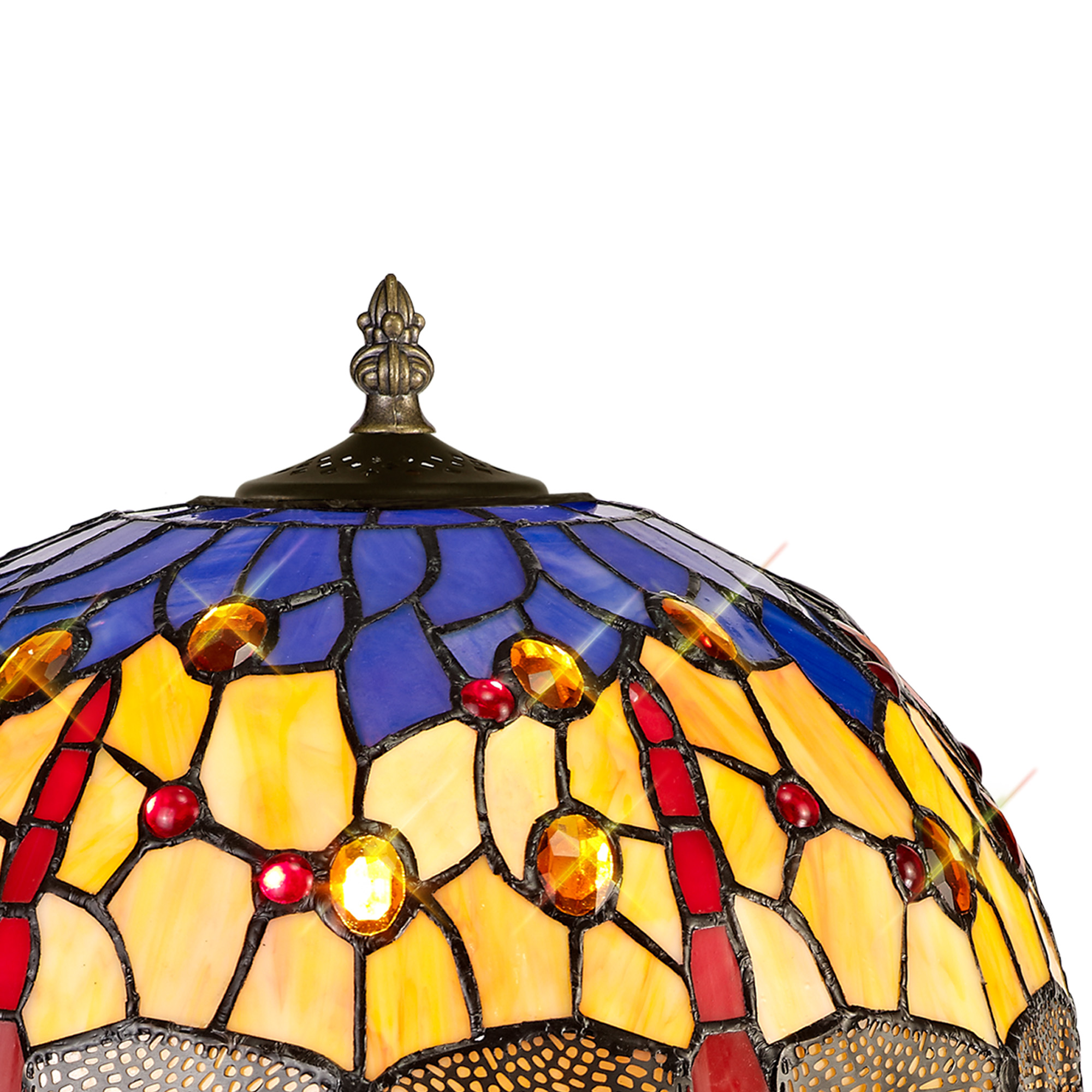 Tiffany glass design features the classic dragonfly form, effortlessly fashioned into the overall mosaic collection of Tiffany glass pieces. Reinterpreting an old-fashioned concept, additional crystal pieces have been inserted into the glass shades providing a touch of modern sparkle and elegance. Available in two colour finishes this beautiful pattern is featured across a comprehensive variety of lighting solutions.