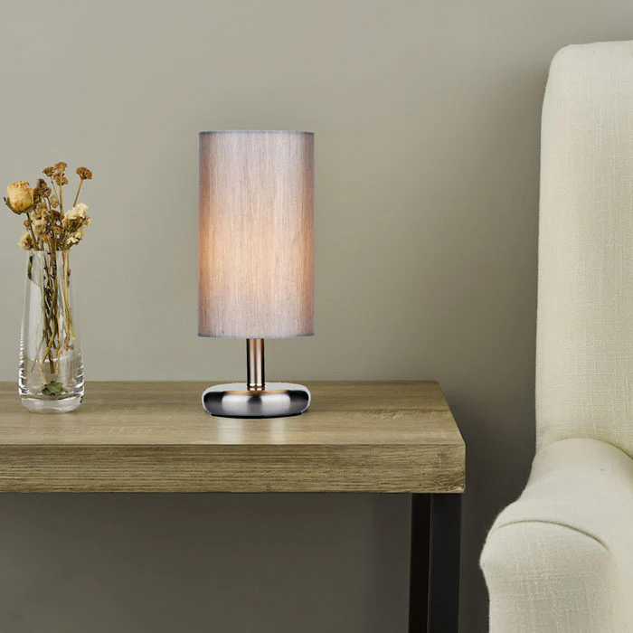 a stylish and practical lighting solution that’s perfect for any room. This lamp features a satin chrome base paired with a sleek grey textured shade, giving your space a modern and trendy look. What sets the Tico apart is its easy-to-use 3-stage touch operation