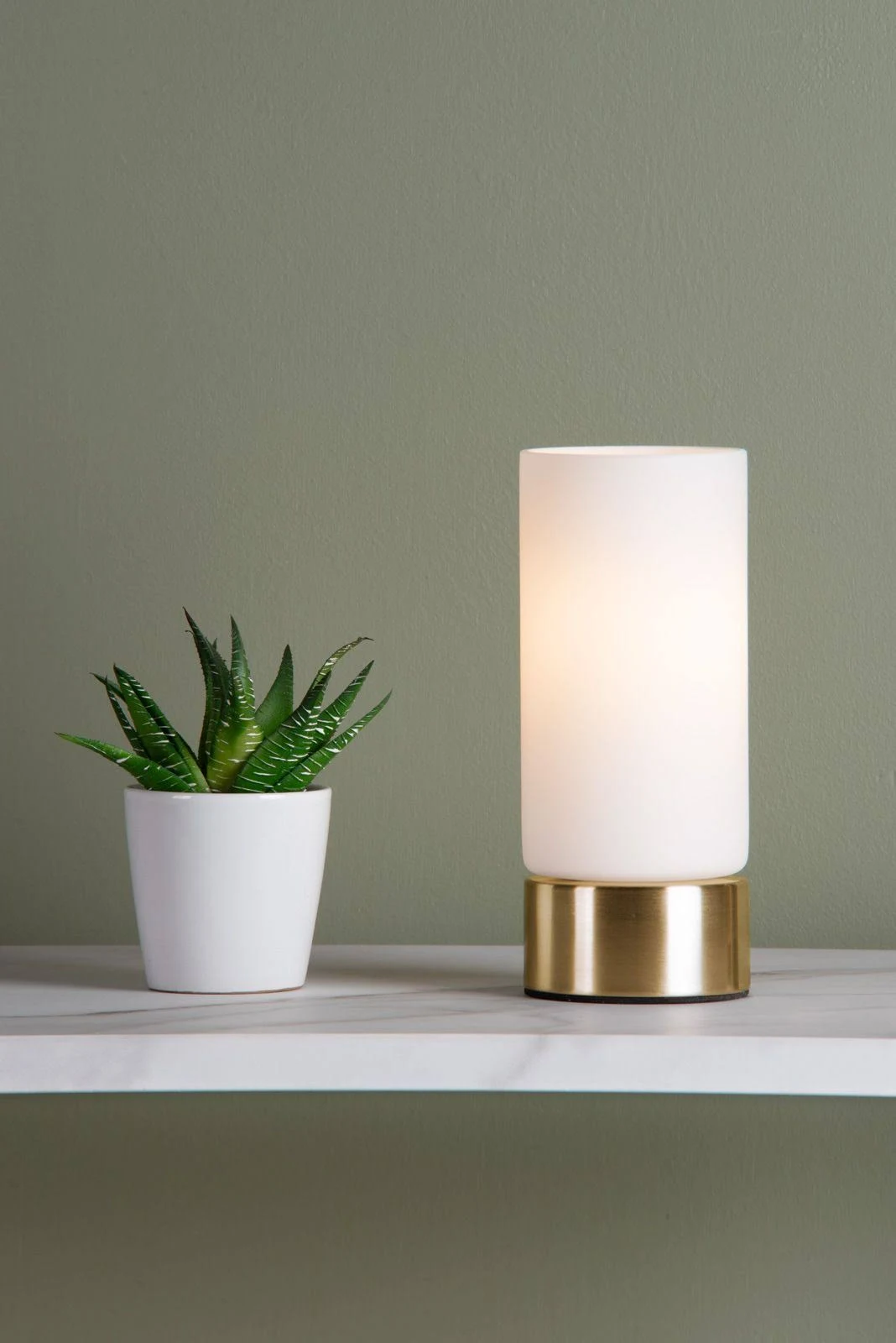 Touch Table Lamp features a sleek cylindrical opal glass shade elegantly resting on a polished gold base. This lamp is equipped with a three-stage touch operation, allowing you to easily adjust the brightness to suit your mood and needs, making it perfect for use as an occasional table lamp where space is limited. Ideal for placement on bedside tables, side tables, or even small desks