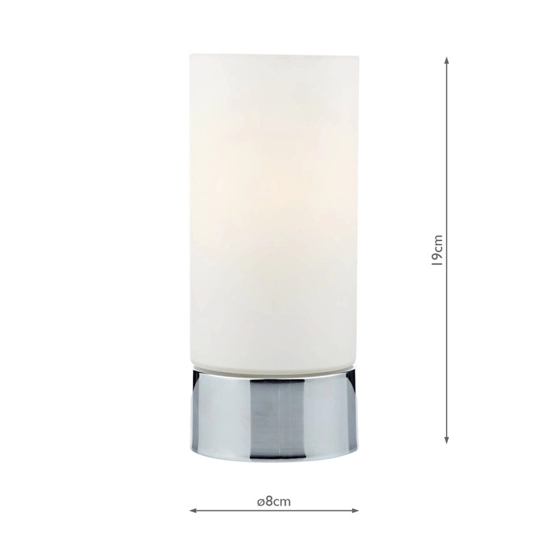 Touch Table Lamp features a cylindrical opal glass shade resting on a polished chrome base. It’s 3 stage touch operated, which makes it perfect as an occasional table lamp where space is limited.