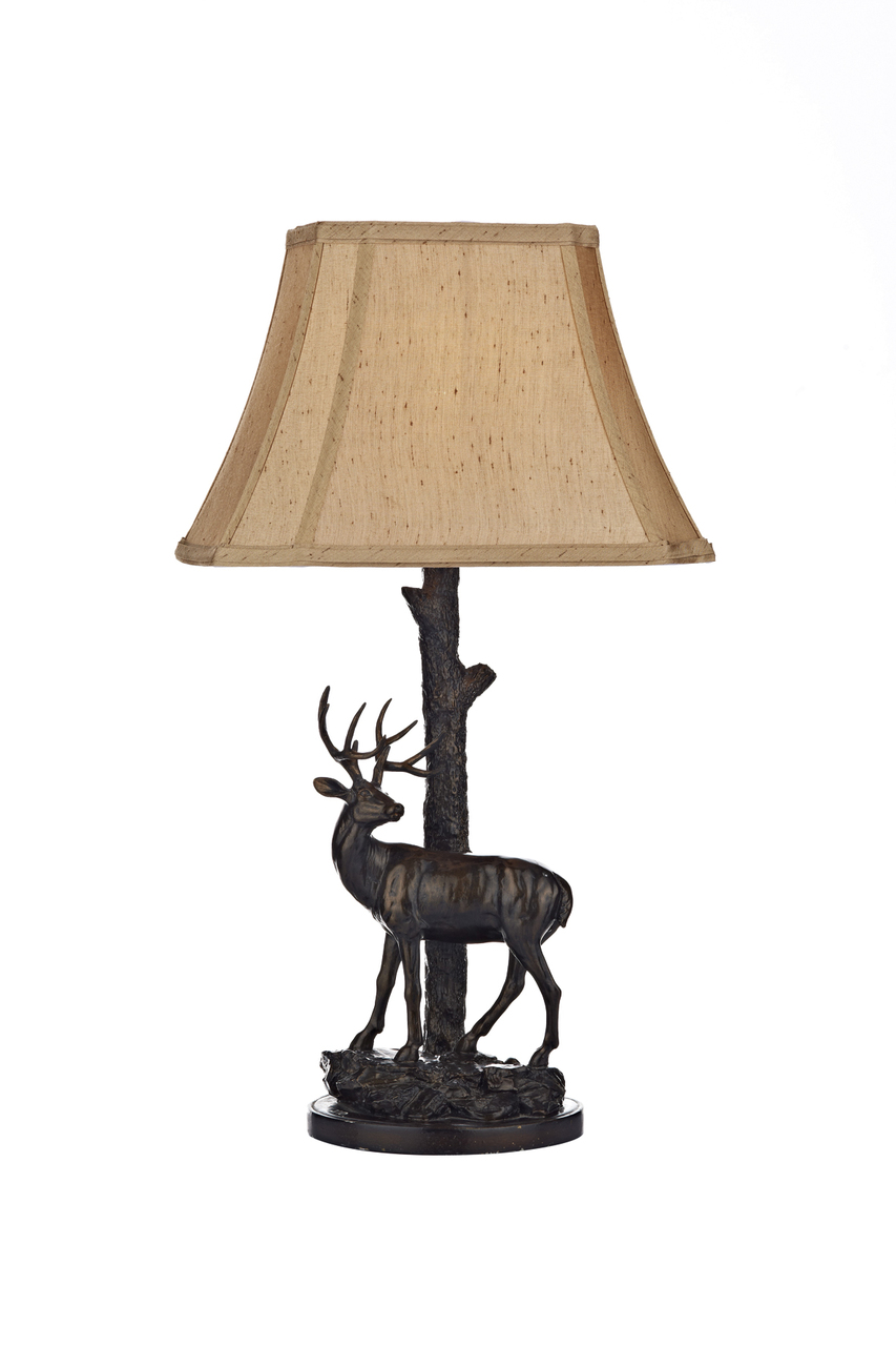 An incredible table lamp. This eye-catching lamp features a bronze base with a deer sculpture and comes complete with a textured faux silk shade., it can also accommodate low energy bulbs.
