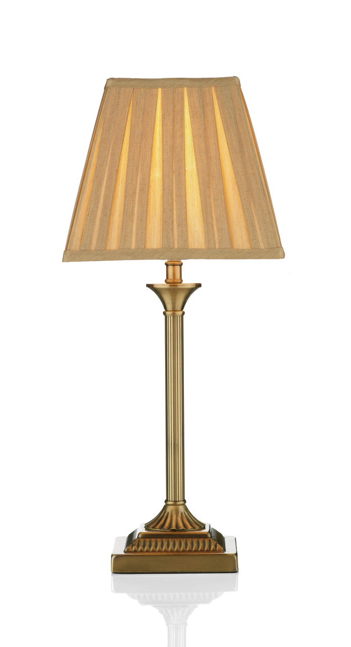A traditional lamp finished in Antique Brass with a Gold Faux silk shade