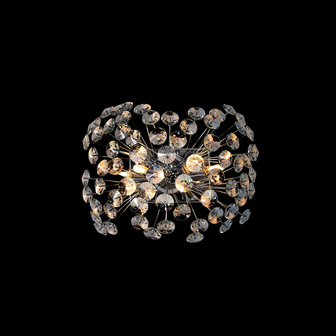 This beautiful comprehensive collection available in either a polished chrome or french gold colour finish, uses slim stems angled erratically to form an enchanting cluster of clear crystal disks. The lines of the central framework of round, tiered and oblong pendants, act as a base from which the crystals can sit around the G9 lampholders ensuring the light emitted from the chosen lamp refracts through each facette throwing sublime spectrums