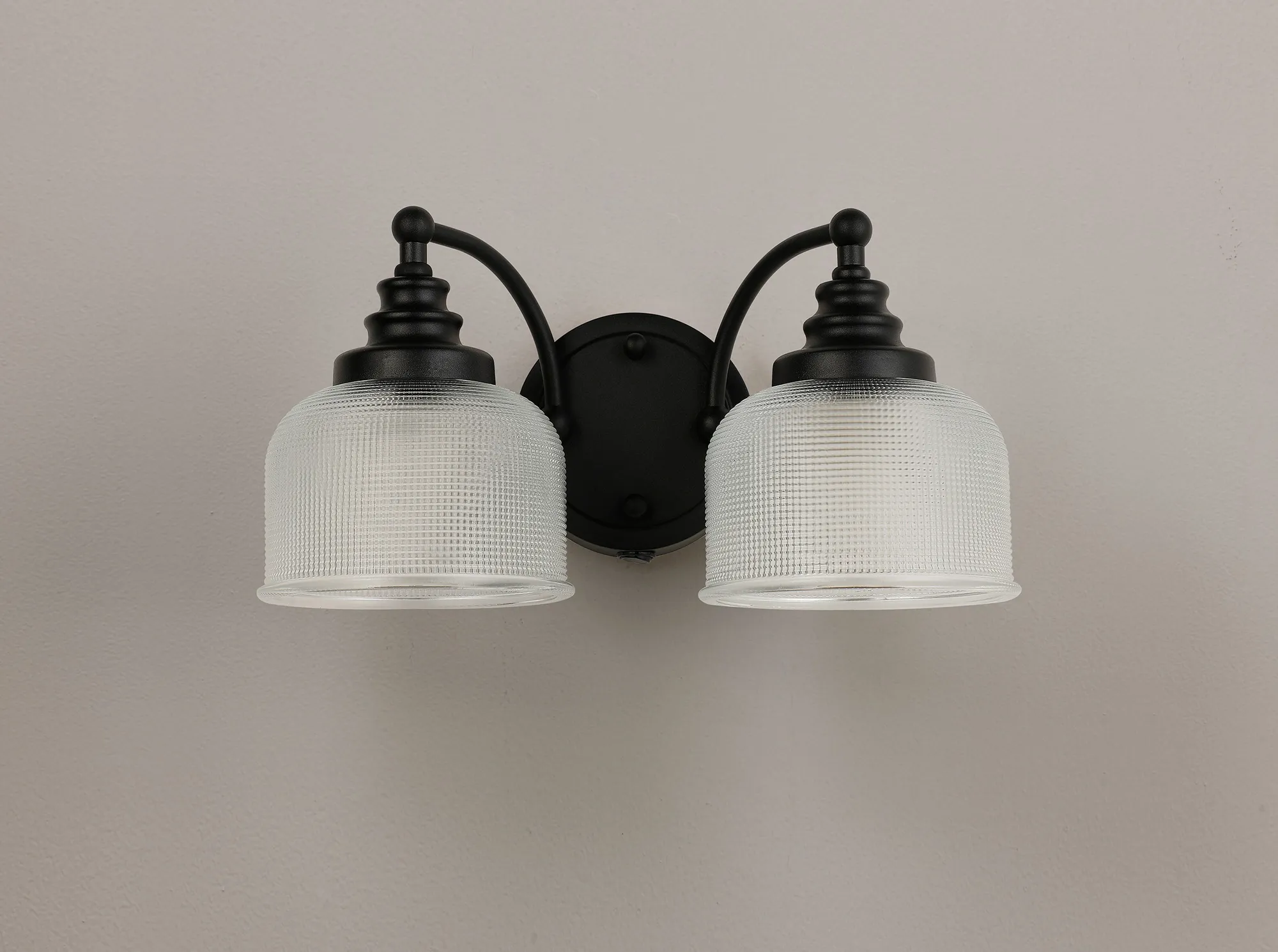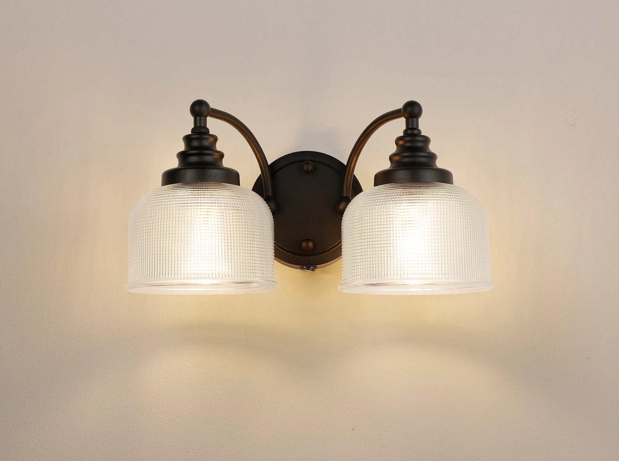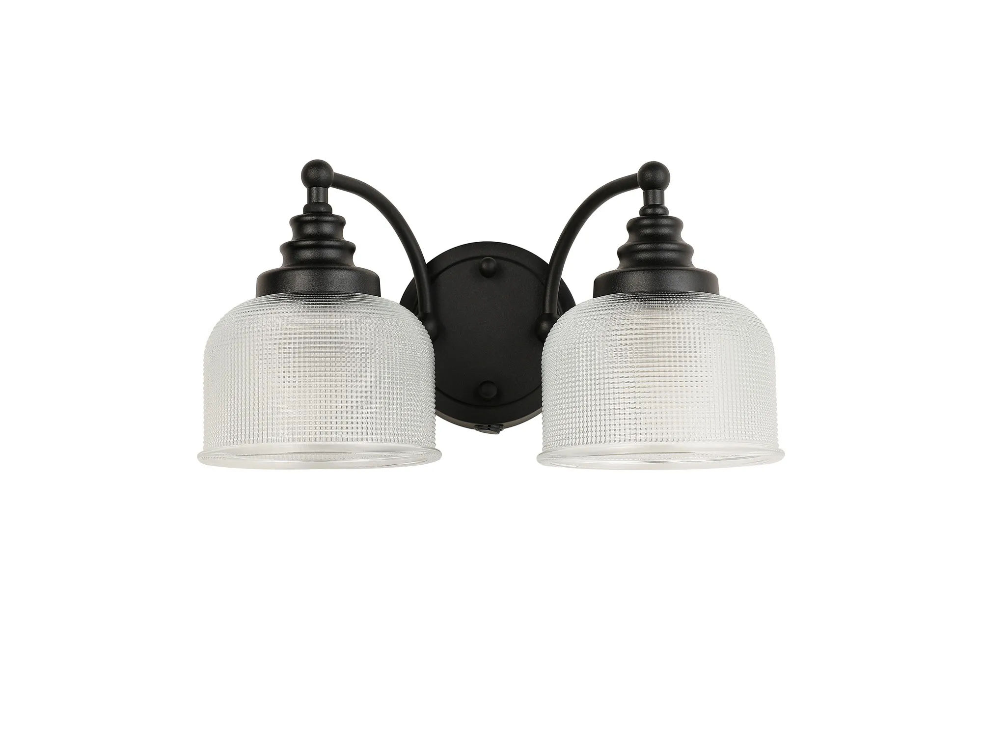 500115655 Sherborne Twin Wall Light Satin Black With Clear Prismatic Glass Shades