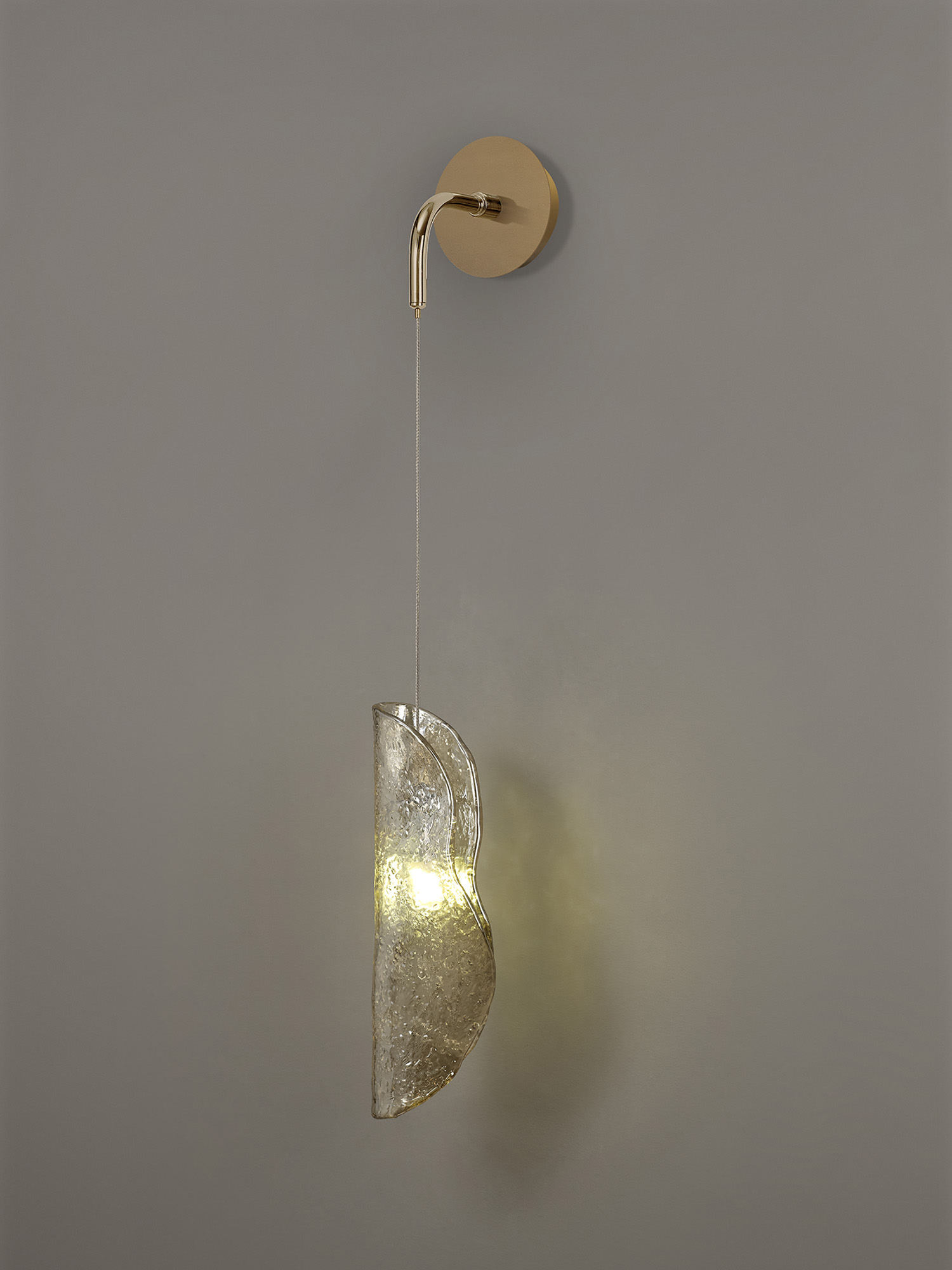 Scroll name is drawn from the wrapped glass pieces which diffuse the light emitted from the G9 lampholders, each suspended from an individual drop. With the picturesque collection of cognac glass. a serene ambience is provoked by the textured surface of each glass piece which shimmers beneath the coloured tint like light on water.