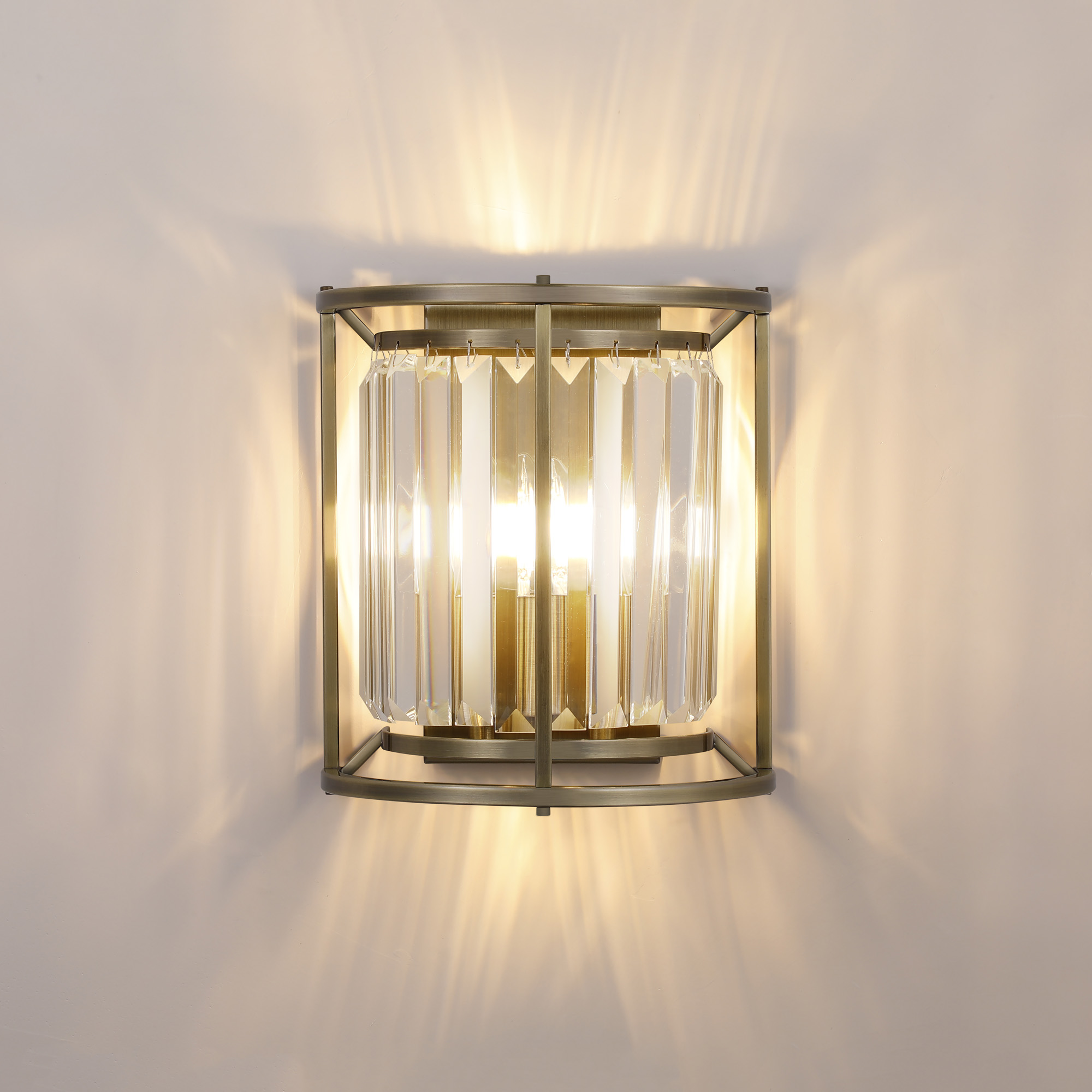 A twin crystal wall light finished in Antique Brass,with long crystal tops which cover up the lamp holders, full range available including flush and pendant ceiling lights as well a matching table lamp.