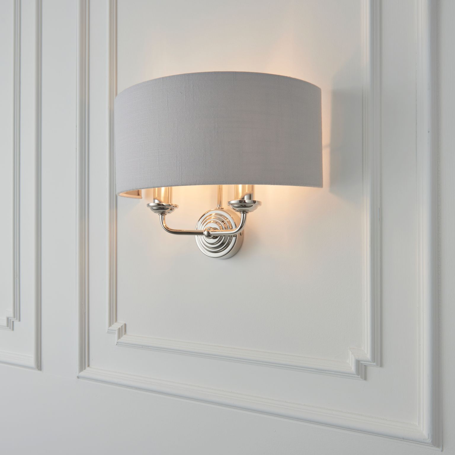 This twin wall light is a sophisticated combination of silver linen mix fabric with a reflective brushed metallic inner and bright nickel metalwork.