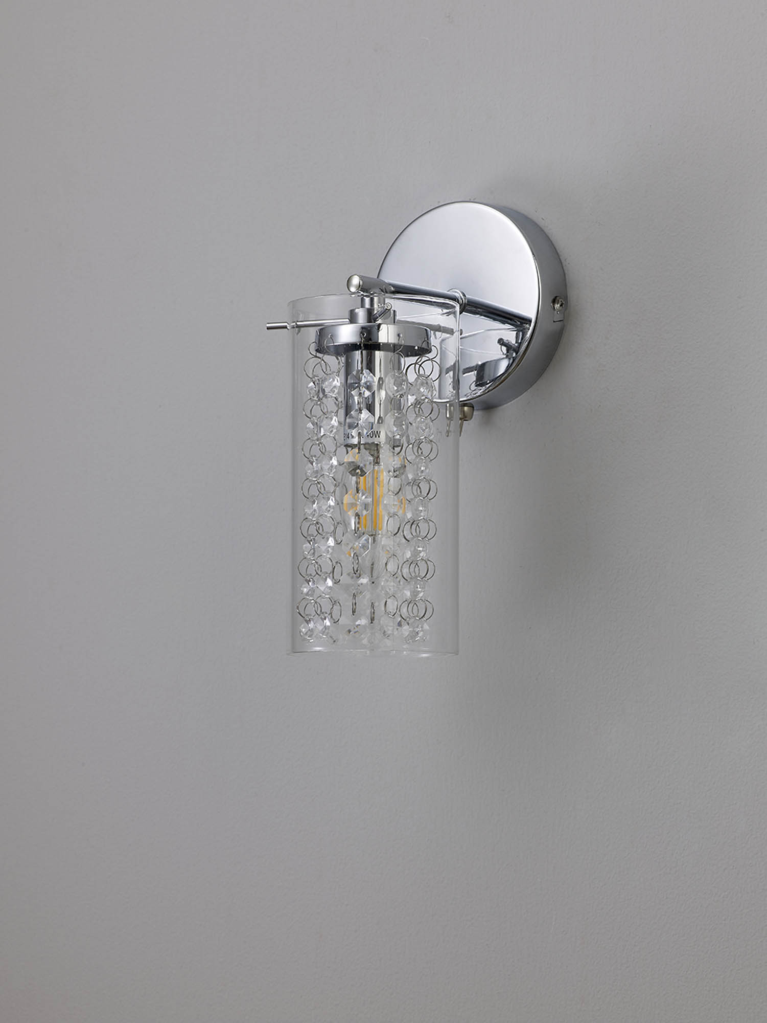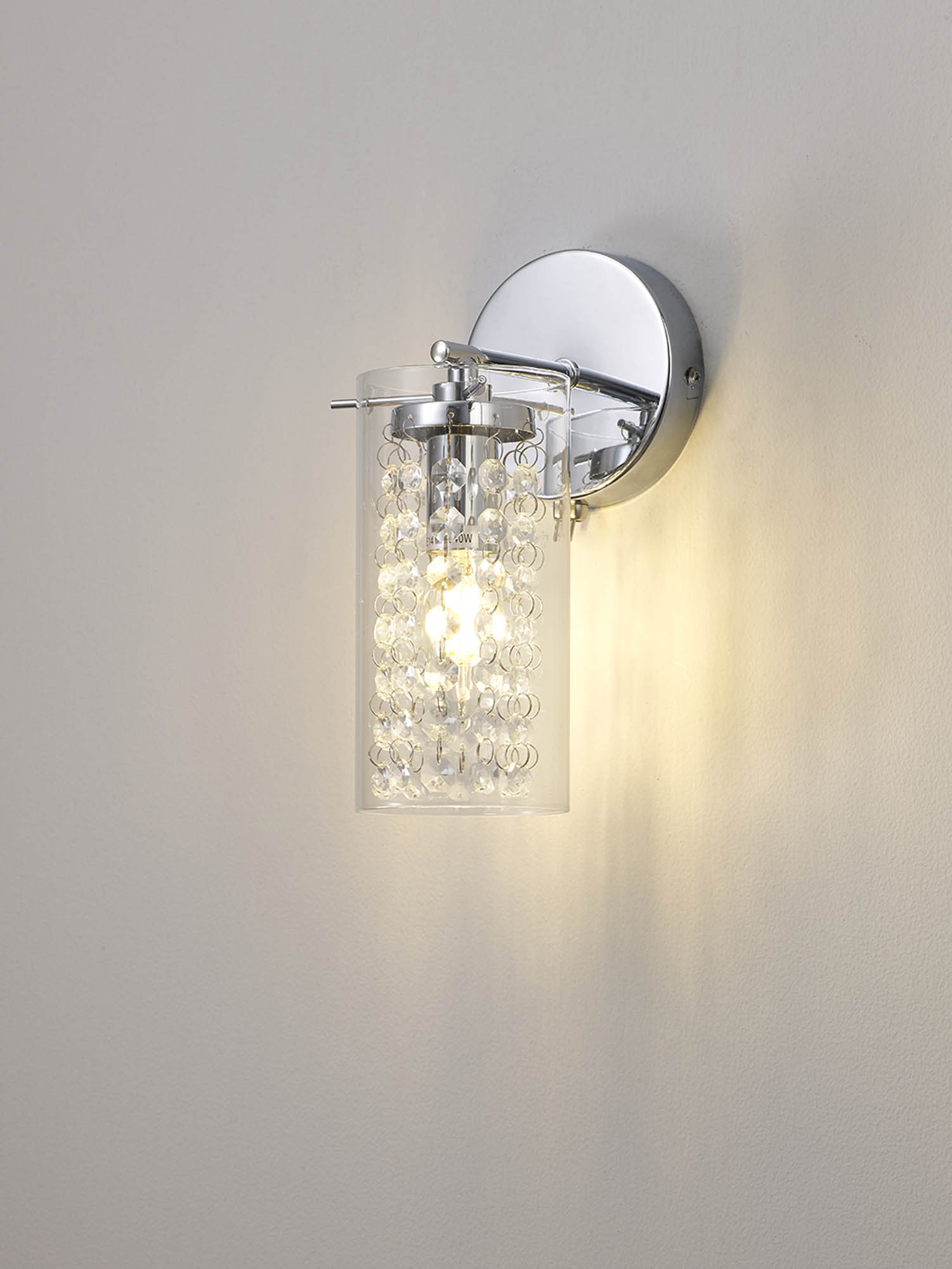 The crystal components add an attractive quality to a seemingly simple design which looks even more striking when the fitting is illuminated delivering an exquisite sparkle. Mona also includes a complementing switched wall and table lamp.