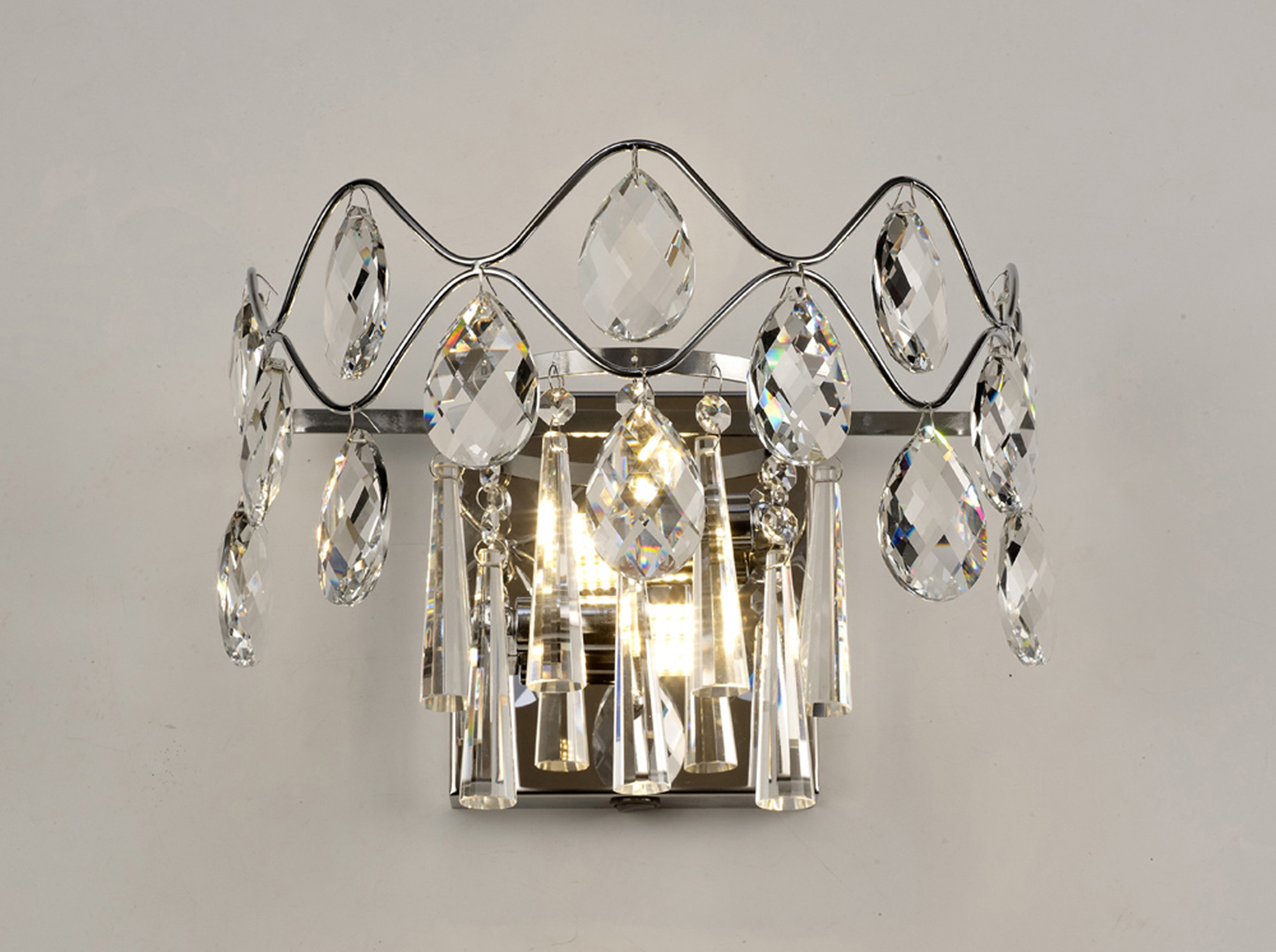 This stunning wall light has large crystal pendalogues with multi angled cuts to create an immense sprakle, The long hexagonal drops create their own statement consequently together they are magnificent.